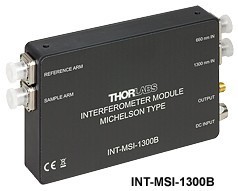 迈克尔逊型INT-MST-1300B干涉仪组件设计用于波长范围在1250到1350纳米内,带有平衡探测装置的光学相干层析成像系统中。为了使用更快的扫描激光器,集成探测器的带宽已经增大到高达100MHz。该模块包括用于迈克尔逊干涉仪的光纤耦合网络,输出为参考臂和样品臂。